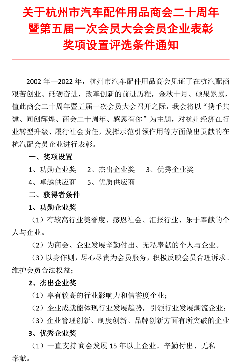關(guān)于杭州市汽車配件用品商會(huì)二十周年 暨第五屆一次會(huì)員大會(huì)會(huì)員企業(yè)表彰 獎(jiǎng)項(xiàng)設(shè)置評(píng)選條件通知