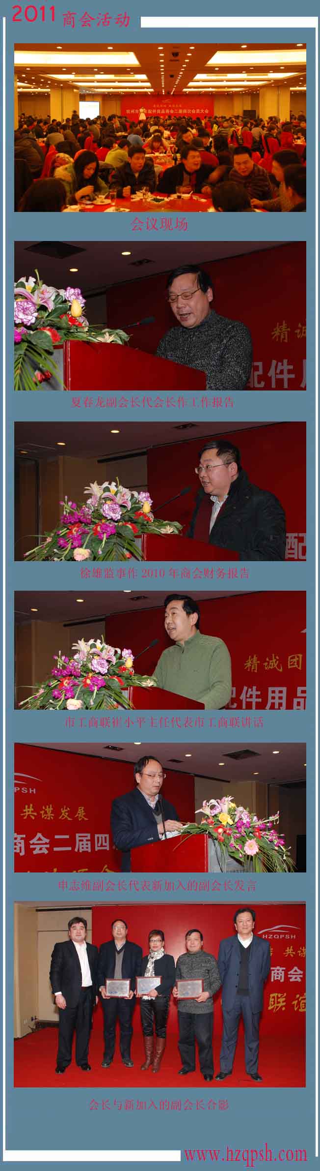 2011年1月12日商會(huì)在東方豪生大酒店隆重召開商會(huì)二屆四次會(huì)員大會(huì)暨迎春聯(lián)誼酒會(huì),約450余邀請嘉賓及會(huì)員參加。首先夏春龍副會(huì)長代會(huì)長作了“爭優(yōu)創(chuàng)先,開創(chuàng)商會(huì)新局面’的2010年商會(huì)工作報(bào)告,接著徐雄監(jiān)事作2010年商會(huì)財(cái)務(wù)報(bào)告。會(huì)長向新加入的三位副會(huì)長授牌,申志維副會(huì)長代表新加入的副會(huì)長作了發(fā)言。市工商聯(lián)宣教處劉志義處長作關(guān)于學(xué)習(xí)新干線的介紹,市工商聯(lián)崔小平主任代表市工商聯(lián)講話,此次會(huì)員大會(huì)在隆重?zé)崃业姆諊薪Y(jié)束。