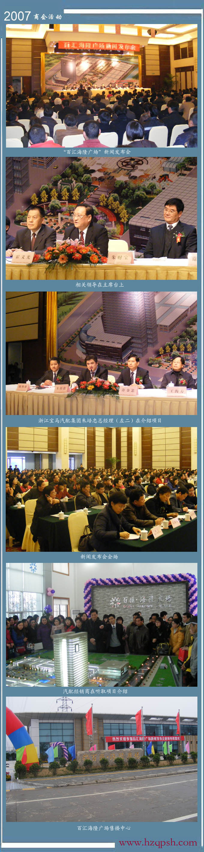 由全國(guó)汽摩配用品商會(huì)、浙江省市場(chǎng)協(xié)會(huì)、海寧市經(jīng)濟(jì)開(kāi)發(fā)區(qū)和浙江寶馬汽配集團(tuán)主辦的“百匯海隆廣場(chǎng)”新聞發(fā)布會(huì),于2007年12月16日在海寧市海州大酒店隆重舉行。全國(guó)工商聯(lián)汽摩配用品商會(huì)會(huì)長(zhǎng)霍義光、浙江省工商管理局常務(wù)副局長(zhǎng)、浙江省市場(chǎng)協(xié)會(huì)會(huì)長(zhǎng)徐志祥、浙江省市場(chǎng)協(xié)會(huì)秘書(shū)長(zhǎng)呂振華、海寧市人大、政府、政協(xié)、經(jīng)濟(jì)開(kāi)發(fā)區(qū)相關(guān)領(lǐng)導(dǎo)出席了會(huì)議。杭州市汽配用品商會(huì)組織了130余家汽配經(jīng)銷(xiāo)商,赴海寧市參加了“百匯海隆廣場(chǎng)”新聞發(fā)布會(huì),并游覽了海寧皮革市場(chǎng)。