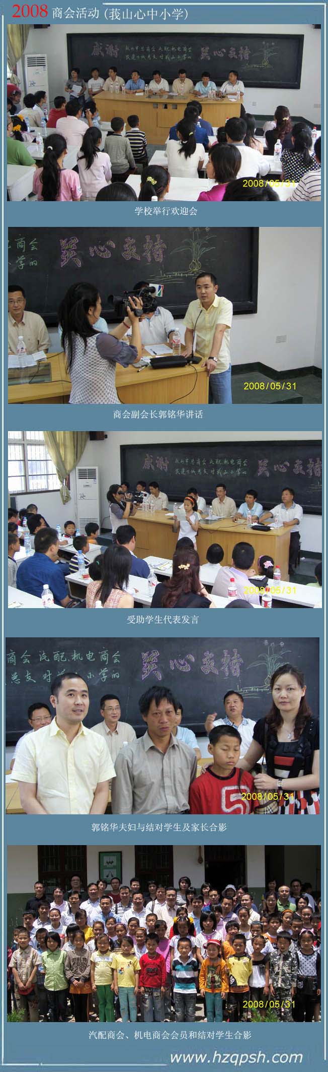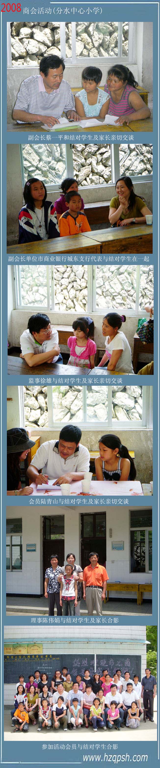 2008年6月1日的前一天,杭州市汽配用品商會在杭州市工商聯(lián)、桐廬市工商聯(lián)領(lǐng)導(dǎo)的帶隊下,第六次赴桐廬莪山中心小學(xué)、第四次赴桐廬分水小學(xué)開展“希望工程’活動。六年來參加資助農(nóng)村困難家庭小學(xué)生的會員們,與結(jié)對的小朋友結(jié)下了深厚的友誼。每到這個時候,孩子們都盼望著能早點見到資助他們的叔叔阿姨們。看到孩子們一天天長大,學(xué)習(xí)有了進(jìn)步,我們的會員們都從心里感到高興,現(xiàn)在很多孩子升入了初中,但資助他們的企業(yè)家還在一如既往的支持他們,希望他們能夠升入高中,直至大學(xué)。