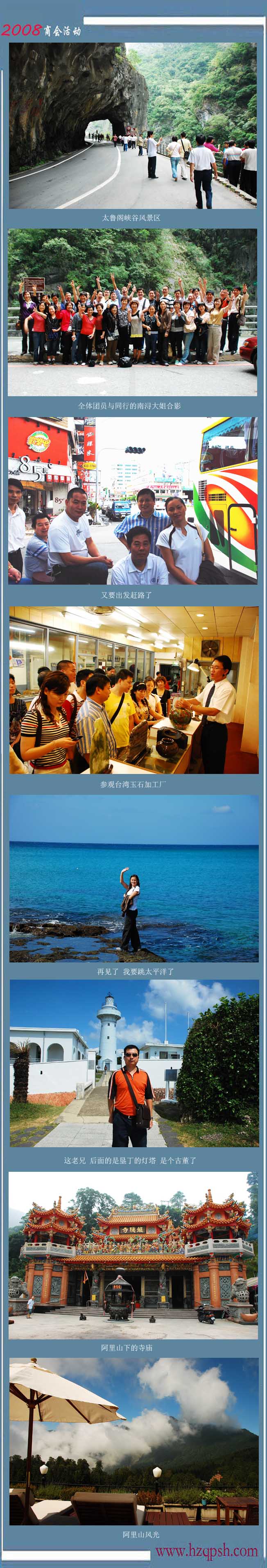 首先我們在臺北參觀了孫中山國父紀念館、臺北故宮博物館、101大樓等景點。接著我們驅車南下,沿著寬闊的太平洋海岸,游覽了太魯閣公園,到了臺灣最南端的墾丁公園,欣賞了三大海峽交界之處。接著沿著崎嶇的山路北上,進入了阿里山森林公園,最后來到了美麗的日月潭。八天時間,團員們天天驅車趕路,各風景點都是走馬觀花,大家都感到沒有深度的觀賞臺灣的美景。這次我們看到了一個真實的臺灣,近幾年臺灣的發(fā)展與大陸相比,已有一定的差距,但大家都感到了臺灣的淳樸民風,良好的治安。大家在滿載而歸時,希望兩岸能夠進一步開放,游覽臺灣更加方便,不用再到香港、澳門轉機。我們期盼兩岸能夠早日統(tǒng)一。