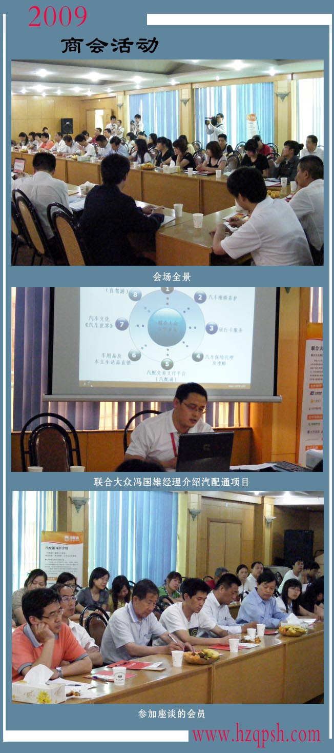 2009年5月8日杭州市汽車配件用品商會(huì)與杭州聯(lián)合大眾汽車網(wǎng)絡(luò)有限公司,在浙江汽配城會(huì)議室召開汽配通項(xiàng)目座談會(huì),參加會(huì)議的有聯(lián)合大眾公司主要成員及三十余位商會(huì)副會(huì)長(zhǎng)、常務(wù)理事、理事。